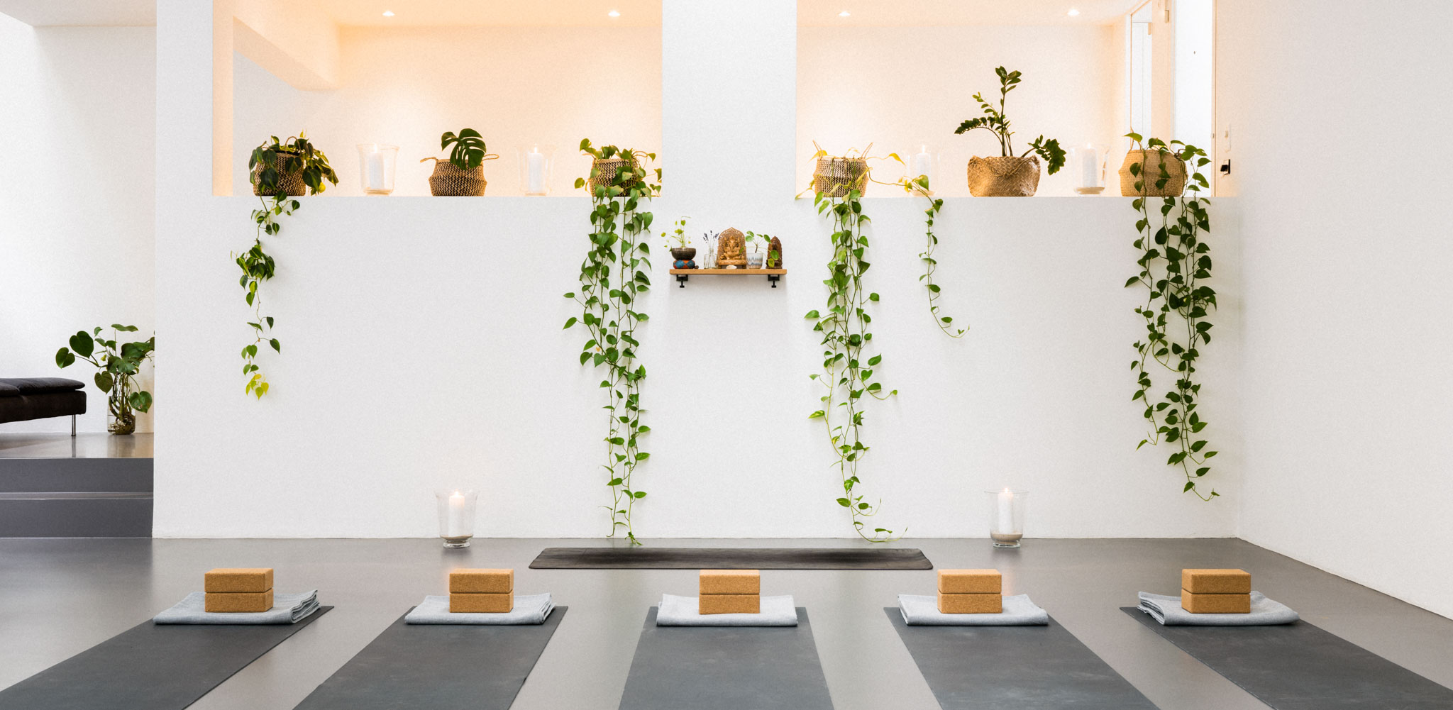 Everything you need to practise yoga – mats, blocks, blankets, bolsters, and belts – are available. Feel free to bring your own. There are two small changing rooms and a shower. You can also relax in our cosy sofa corner while drinking warm tea.